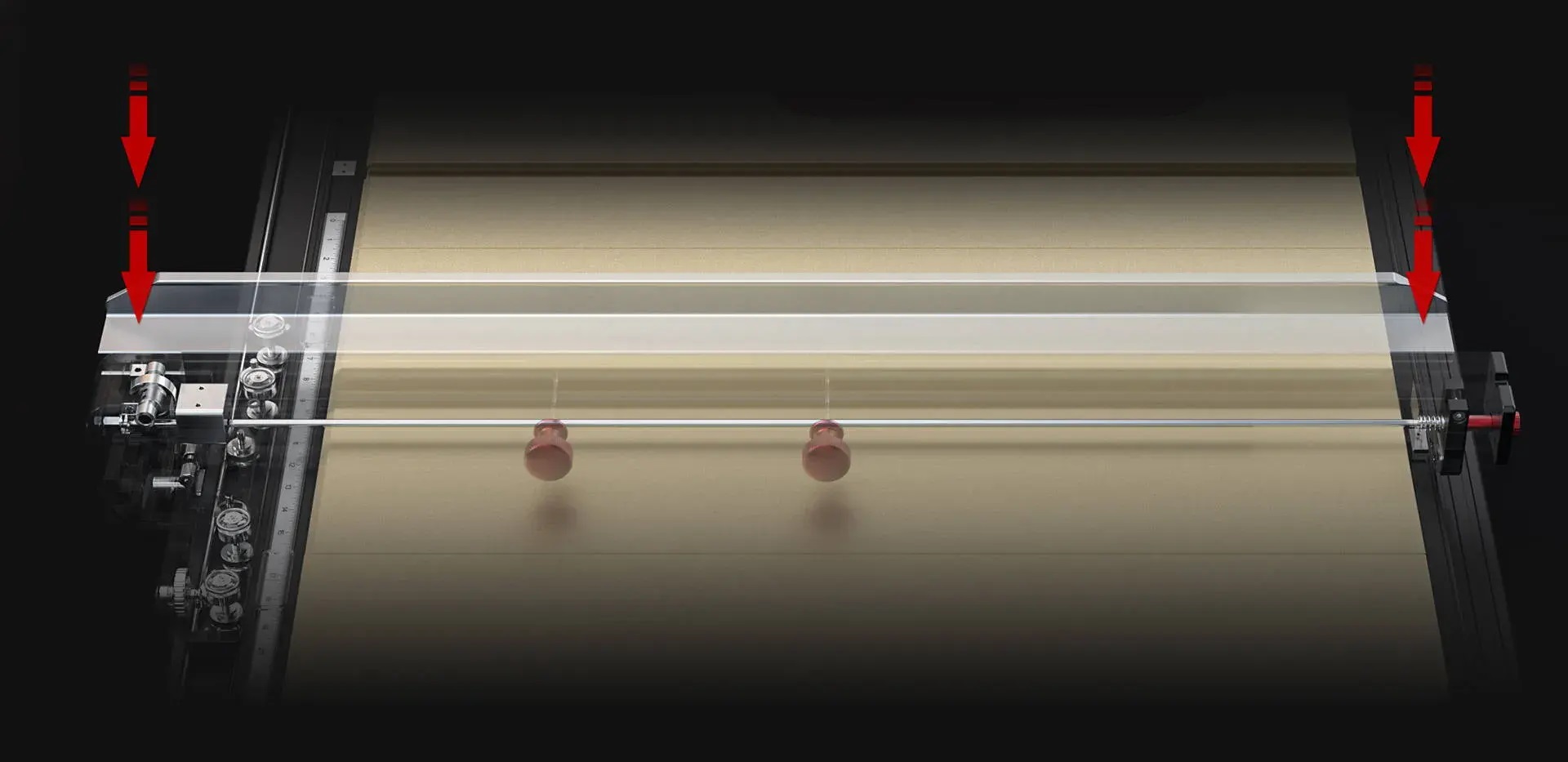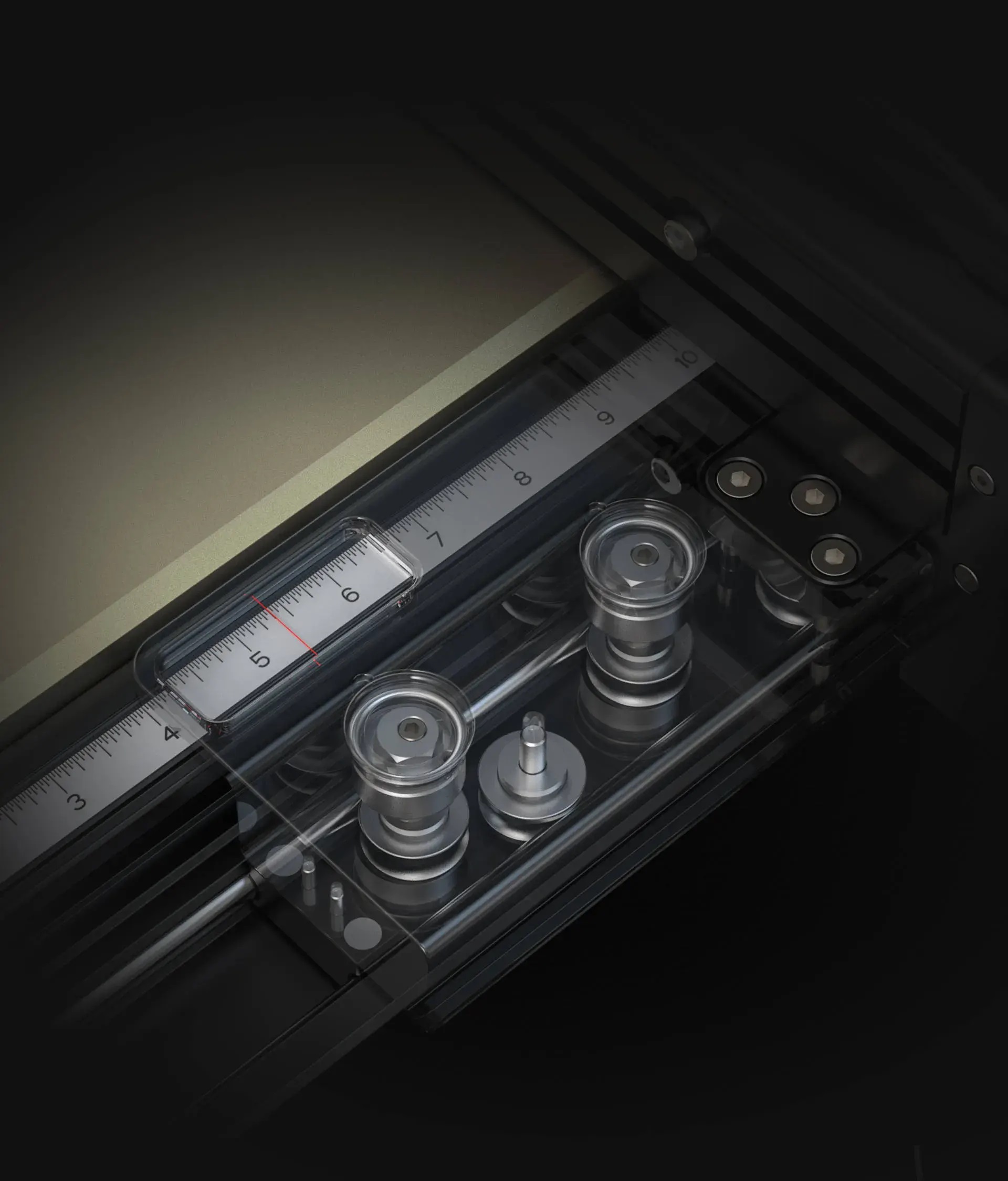 | デュアル軸リニアガイドと8つのベアリングローラーにより、ガタのない滑らかな動きと全長0.15mmの高精度を実現しています。 | 固定・調整ベアリングによりガタをなくし、鋸刃との平行を保った滑らかな動作を実現しています。 |