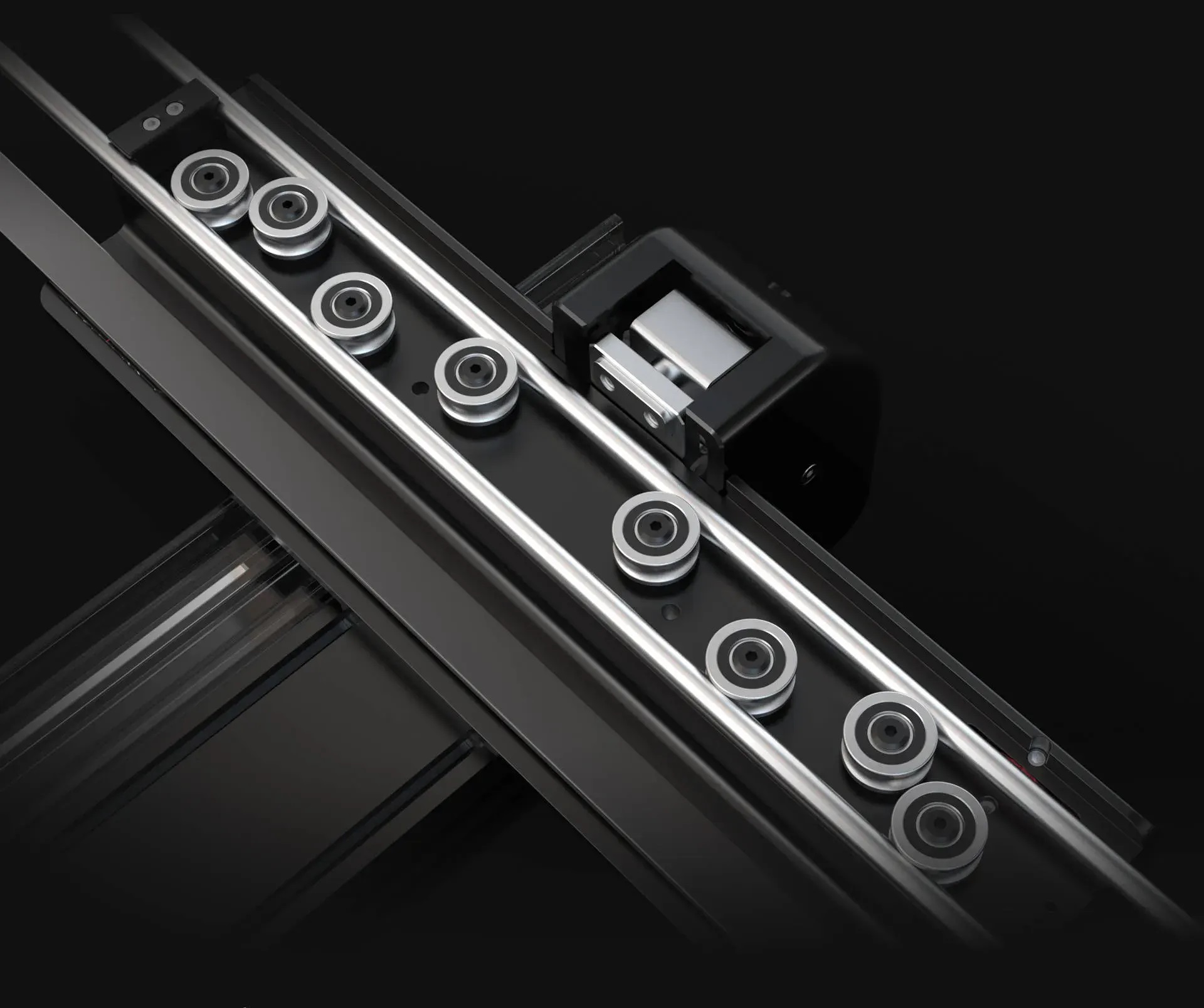| デュアル軸リニアガイドと8つのベアリングローラーにより、ガタのない滑らかな動きと全長0.15mmの高精度を実現しています。 | 固定・調整ベアリングによりガタをなくし、鋸刃との平行を保った滑らかな動作を実現しています。 |